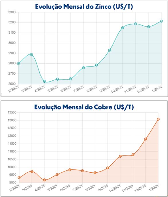 O zinco, apesar de oscilações ao longo dos meses, mantém patamares elevados, o que contribui para o aumento do custo de ligas metálicas e componentes industriais.